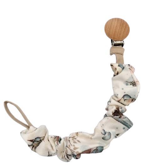 Materiałowa zawieszka do smoczka z drewnianym klipsem, wykonana z 96% bawełny i 4% elastan