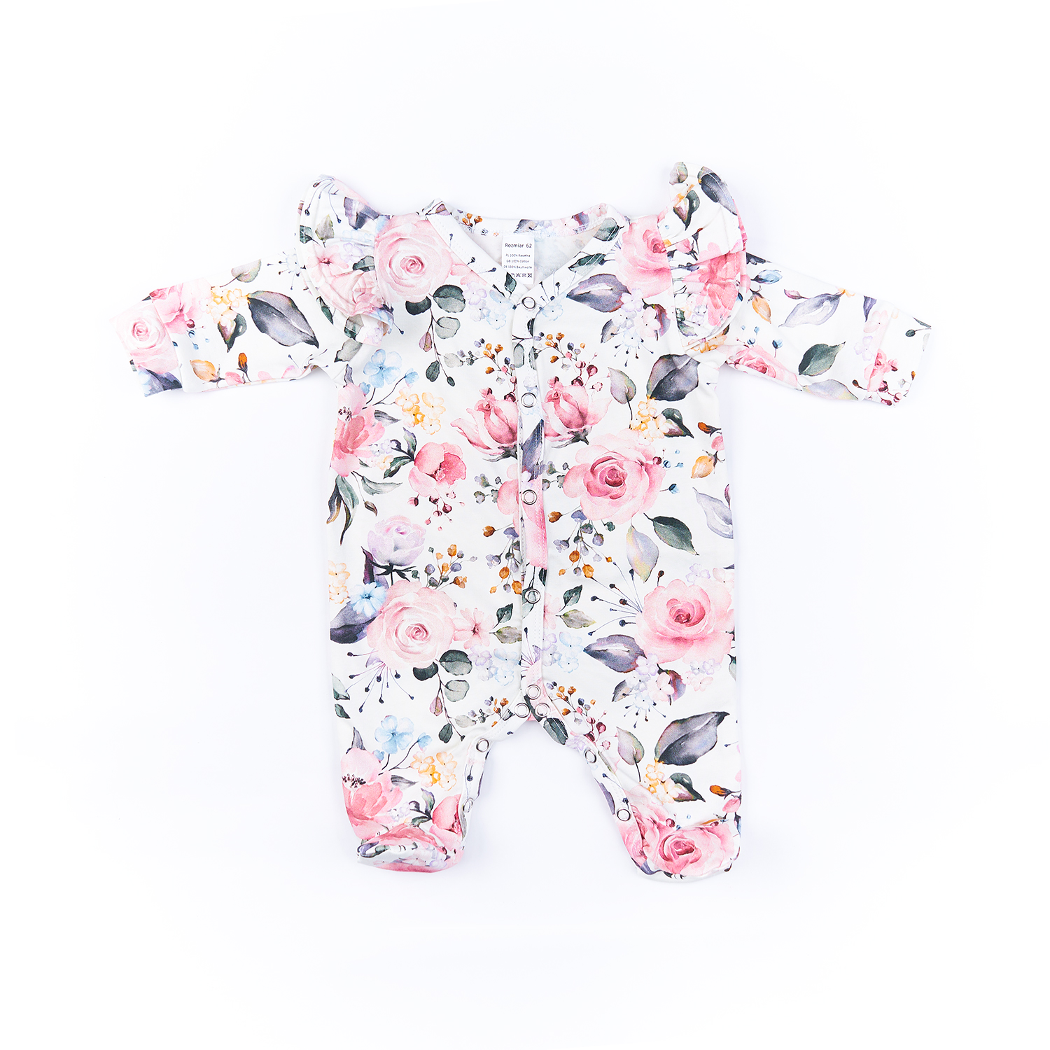 Pajac niemowlęcy z długim rękawem i uroczymi falbankami na ramionach