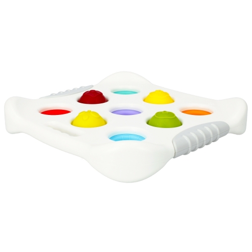 Unikalna Tablica sensoryczna Bam Bam to zabawka, która przynosząc wiele doznań sensorycznych doskonale wpływa na rozwój dziecka na wielu płaszczyznach. Osadzone na tablicy miękkie półkule w ilości 9 sztuk, w bajecznych, tęczowych kolorach, po naciśnięciu powracają do swojego pierwotnego kształtu. Zabawa angażuje malucha na długo, daje mu masę powodów do śmiechu, rozwijając przy tym jego zdolności manualne oraz motorykę małą. Wypukle bąbelki opatrzone są z jednej strony figurami geometrycznymi, a od strony wewnętrznej , po obróceniu tablicy na drugą stronę, cyframi od 1 do 9, co daje solidne podłoże do kształcenia geniusza matematycznego już od 10 m-ca życia. Wymiary/waga/baterie: wymiary produktu (dł. x wys. x gł.)[cm]: 18x3x19, wymiary opakowania (dł. x wys. x gł.)[cm]: 20x20x4, waga produktu bez opakowania [kg]: 0,17 kg, waga produktu w opakowaniu [kg]: 0,22 kg, nie wymaga zasilania bateriami. Zabawka przeznaczona dla dzieci w wieku: 10m+. Pakowana w kartonik z okienkiem.