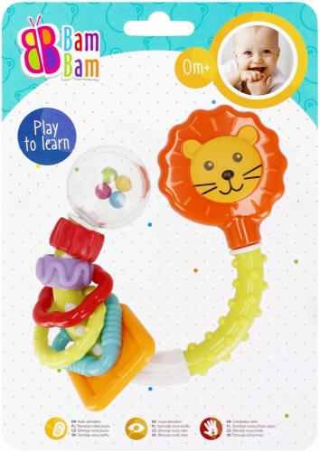 GRZECHOTKA LWIĄTKO: Grzechotka Lew BAM BAM o stonowanej kolorystyce dostarcza wiele radości dziecku już od narodzin. Potrząsanie zabawki, wywołuje charakterystyczne dźwięki uwrażliwiając je na rozróżnianie ich natężenia. Kolorowe krążki oraz kuleczki w przeźroczystej kuli na pewno zaciekawią malucha . Zabawka rozwija zmysł wzroku, dotyku, słuchu oraz zdolności manualne dziecka. Wymiary/waga/baterie: wymiary produktu (dł. x wys. x gł.)[cm]: 12x13x4, wymiary opakowania (dł. x wys. x gł.)[cm]: 15x20x4, waga produktu bez opakowania [kg]: 0,07 kg, waga produktu w opakowaniu [kg]: 0,09 kg, nie wymaga zasilania bateriami. Zabawka przeznaczona dla dzieci w wieku: 0m+. Pakowana na blistrze. W kartonie zbiorczym po 24 szt.