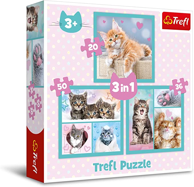 Trzy układanki w różnej wielkości przedstawiają urocze małe kotki. Dzięki zróżnicowanej liczbie elementów puzzle dają zabawę młodszym oraz nieco starszym dzieciom.