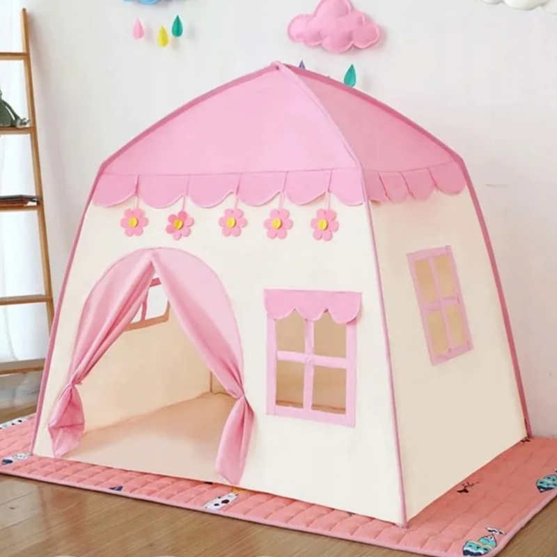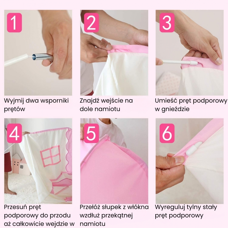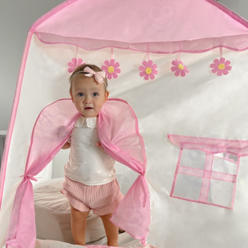 Namiot w kształcie domku w delikatnym odcieniu różu, który idealnie wpasuje się w wystrój pokoju każdej dziewczynki