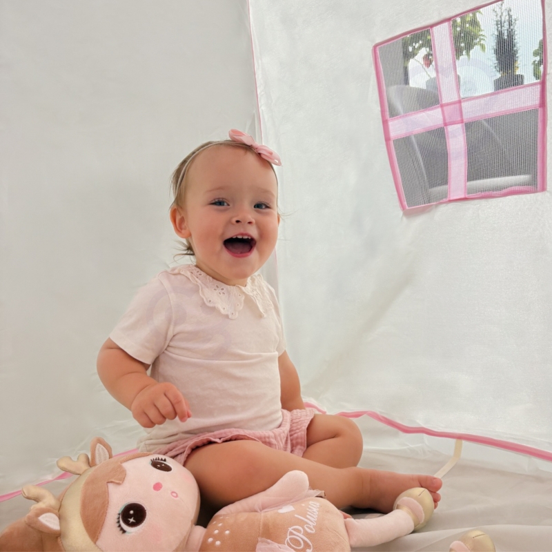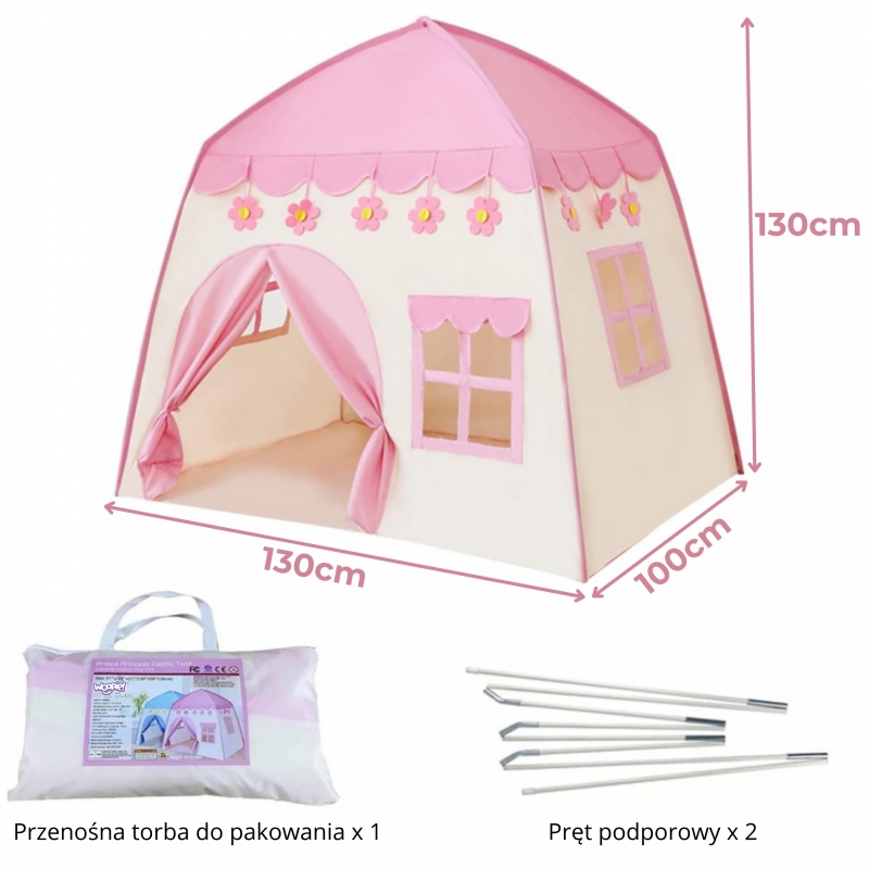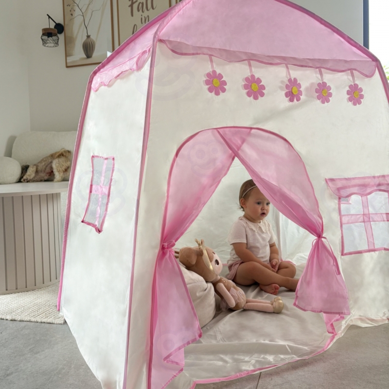 Ten uroczy różowy namiot domek od marki Woopie to idealne miejsce, gdzie Twoje dziecko będzie mogło przenieść się do świata bajkowych przygód, snuć fantastyczne opowieści i bawić się w królewskim stylu! Stworzony z dbałością o detale, stanie się sercem każdego pokoju dziecięcego.